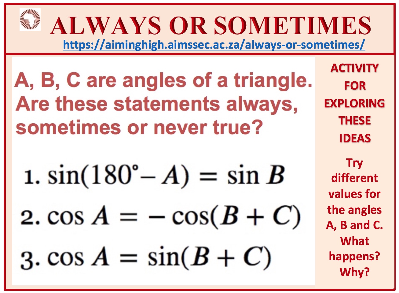 Angles A, B and C are the angles of a triangle. Decide whether each of the following is an identity, always true for all triangles, or an equation, sometimes true. If you decide it is an equation find the solution or solutions and describe the corresponding triangle.