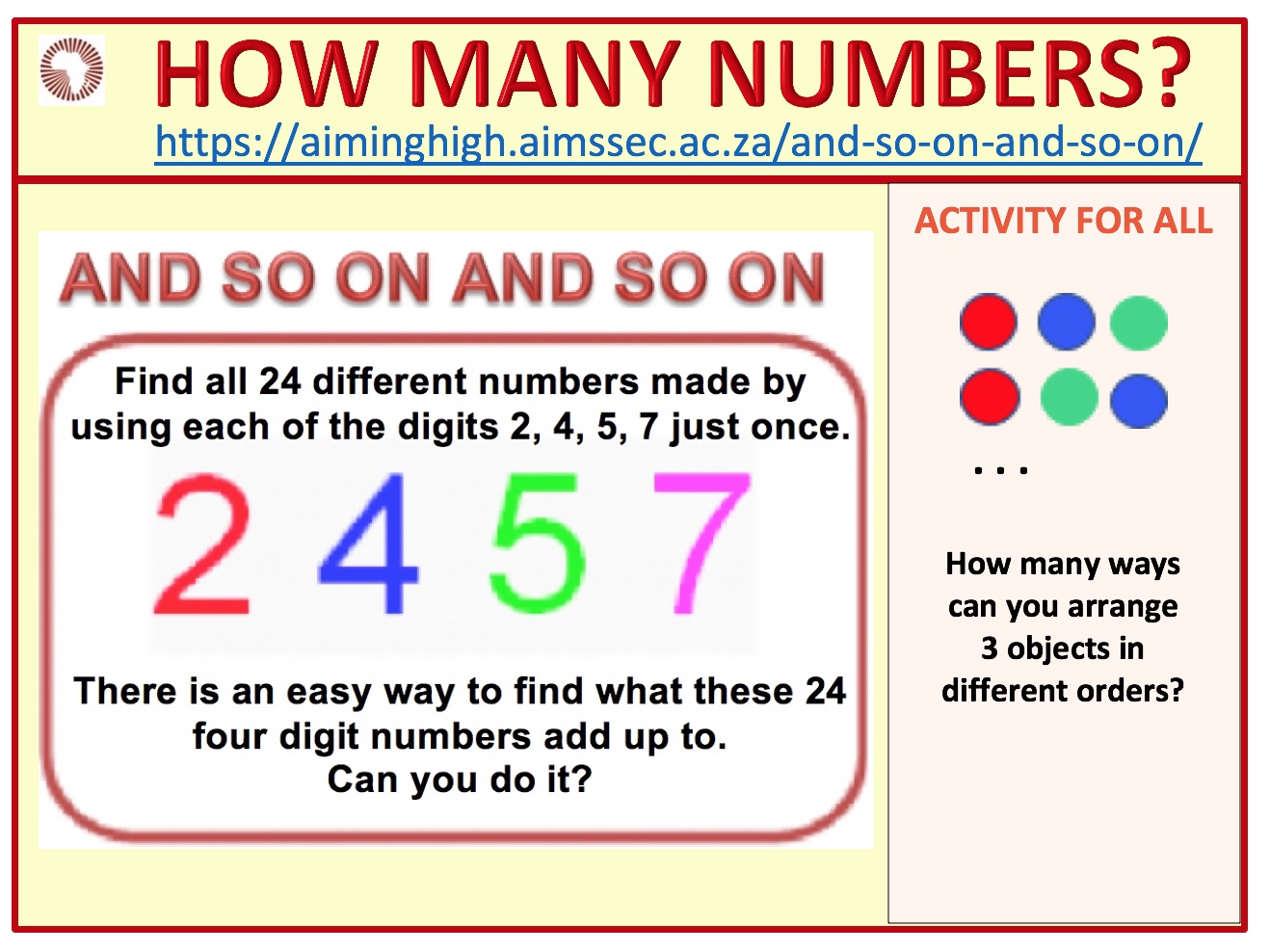 If you change the order of these digits you can get 24 different numbers, for example 2547, 2574, 2745, … Can you find all 24 different numbers made by using each of the digits 2, 4, 5, 7 just once?