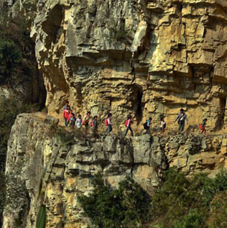 The picture shows a 5 hour journey into the mountains on a narrow path to probably the most remote school in the world in Gulu, China.