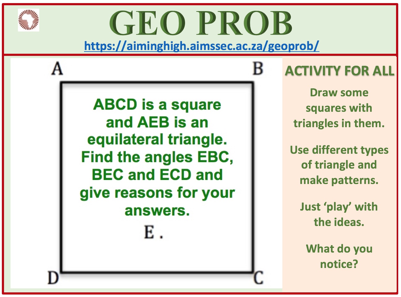 The point E is inside the square ABCD and AEB is an equilateral triangle. Find the angles EBC, BEC and ECD and give reasons for your answers.