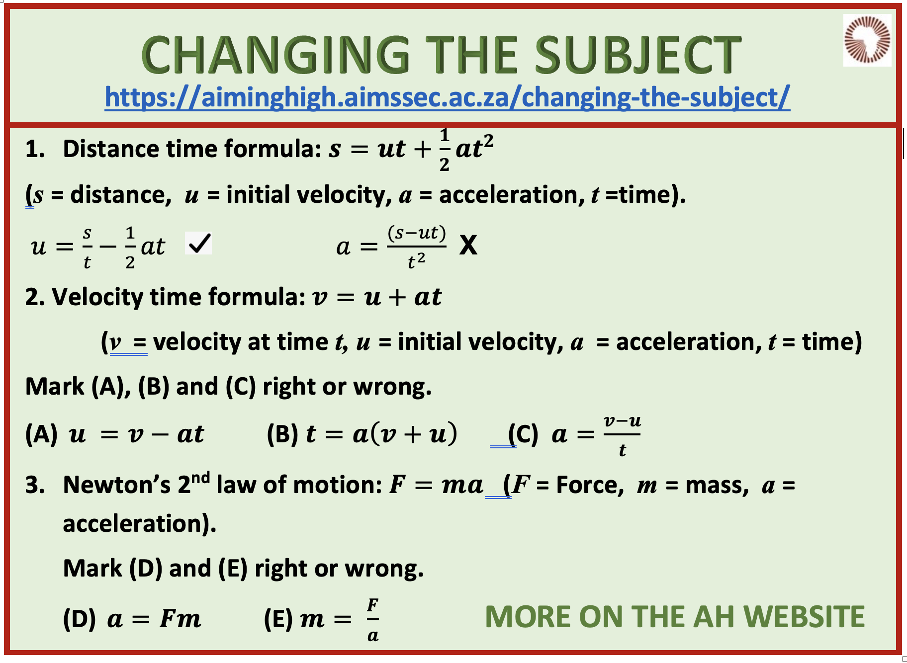 Click here to download the CHANGING THE SUBJECT worksheet.