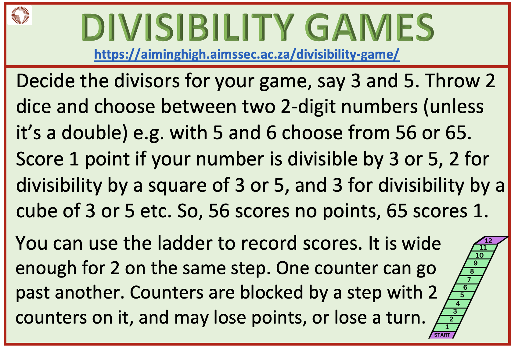 The only resources needed are 2 dice and pencil and paper for scoring. Decide the divisors for your game, say 3 and 5. Throw 2 dice and choose between two 2-digit numbers (unless it’s a double) e.g. with 5 and 6 choose 56 or 65. Score 1 point if your number is divisible by 3 or 5, 2 for divisibility by a square of 3 or 5, and 3 for divisibility by a cube of 3 or 5 etc. For example :