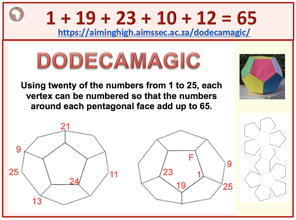 Using twenty of the numbers from 1 to 25, each vertex can be numbered so that the numbers around each pentagonal face add up to 65.