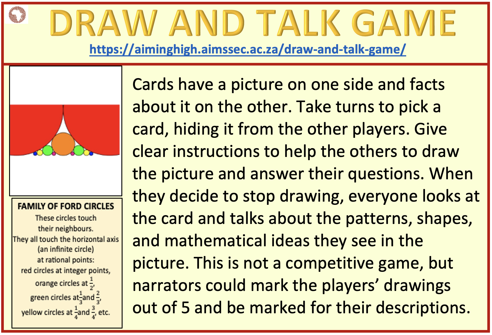 This is a good game for large gatherings. Players don’t need to spend long drawing unless they want to. Every card has a story to tell. Talking about what different players see in the pictures will uncover some of the story. Following up on the notes on the reverse side of the card, and studying more mathematics, will uncover more. Mathematics is not just about numbers!