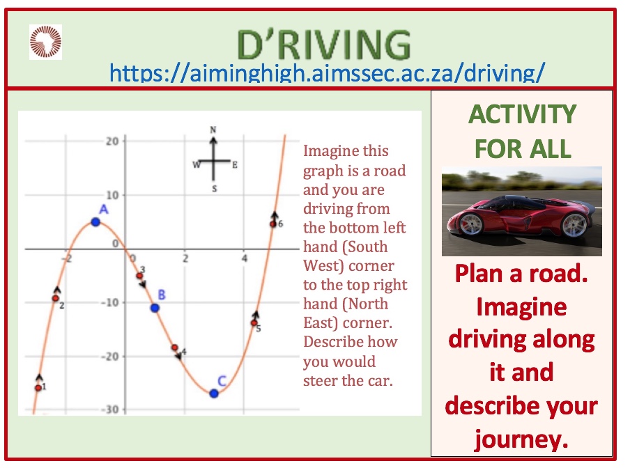 Imagine this graph is a road and you are driving from the bottom left hand (South West) corner to the top right hand (North East) corner. Describe how you would steer the car.