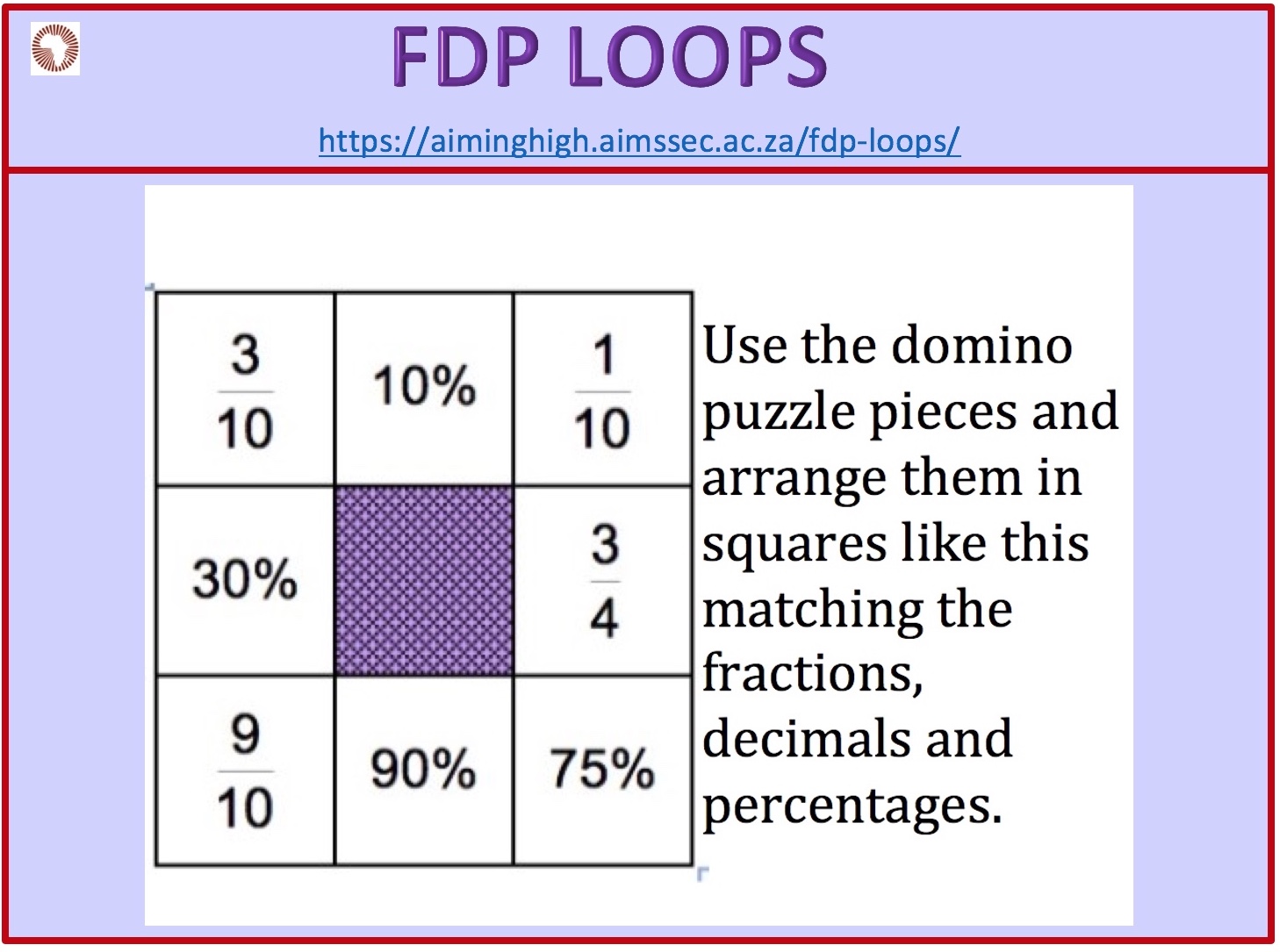 Also play the interactive game ‘Matching Fractions, Decimals and Percentages on NRICH https://nrich.maths.org/1249