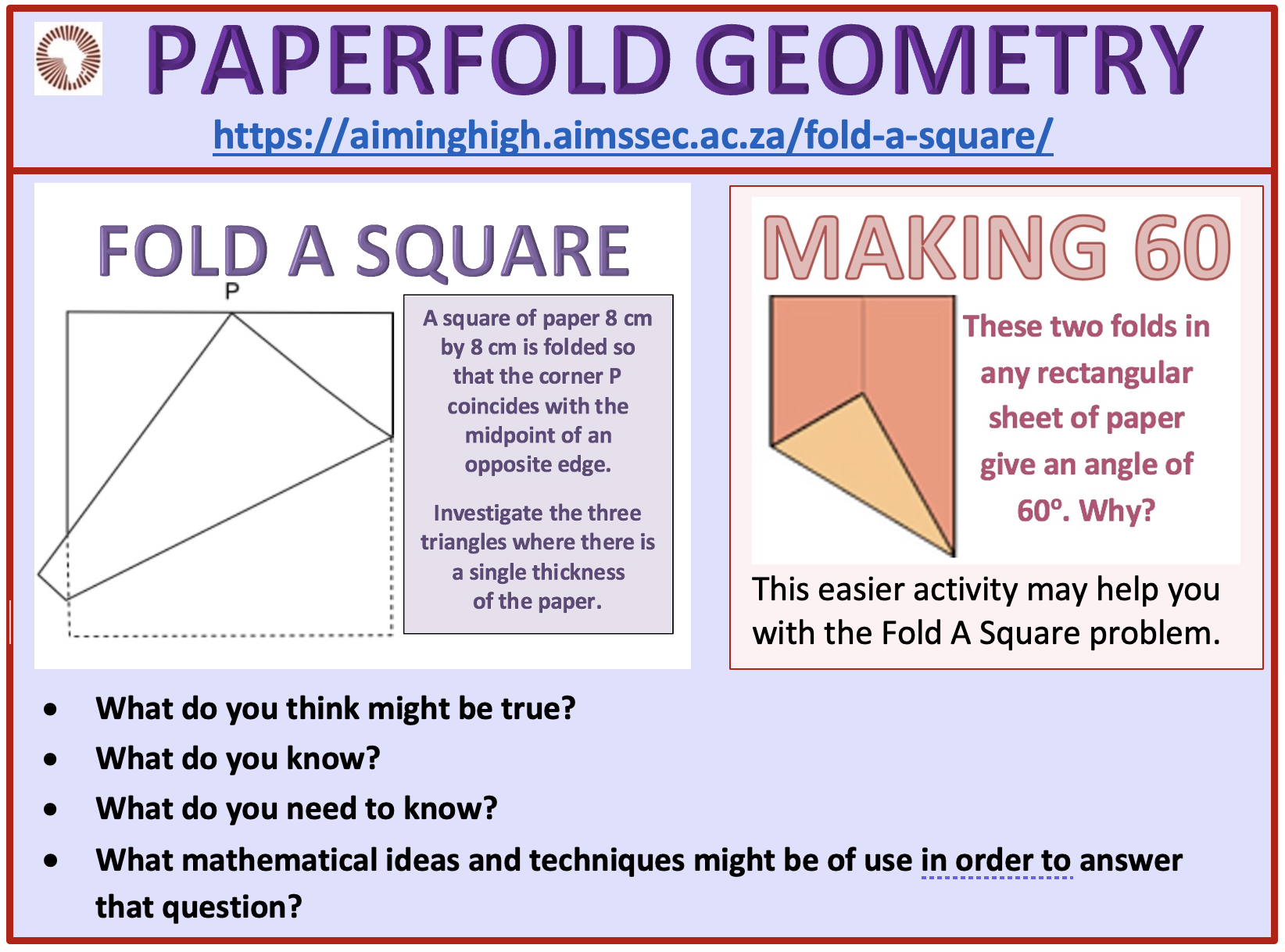 Click here for the FOLD A SQUARE worksheet.