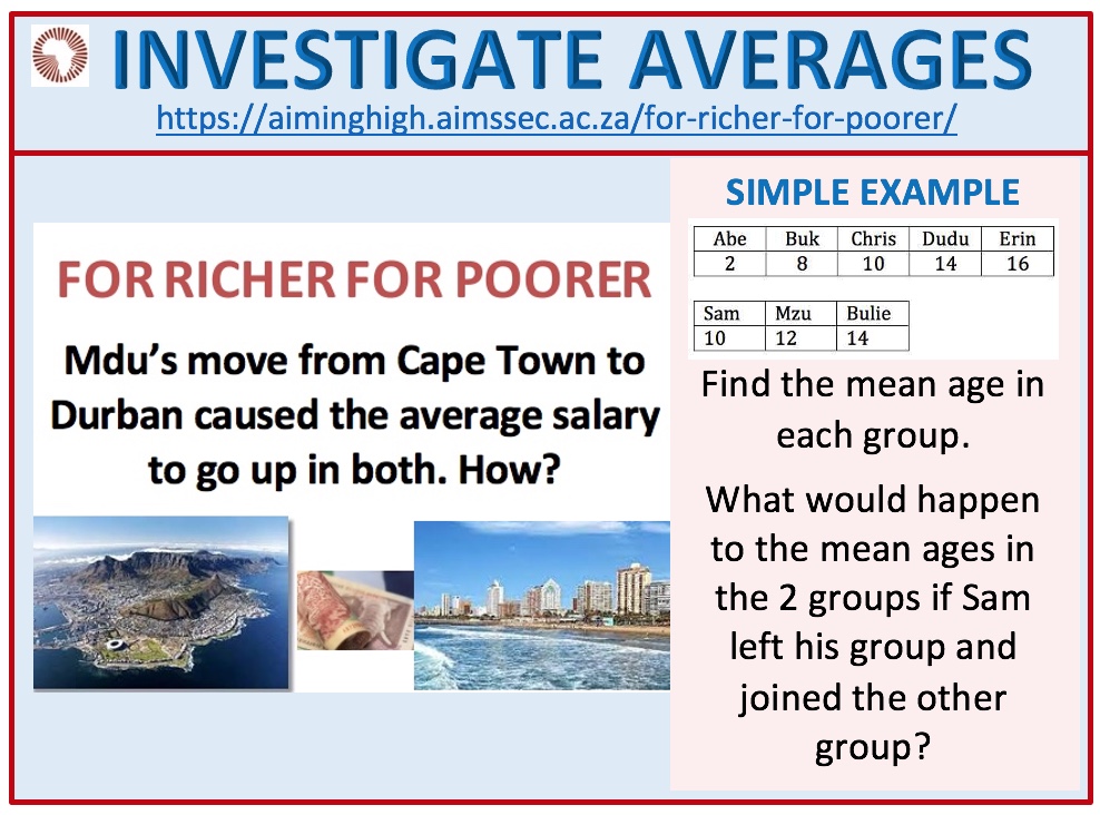 My grade 4 learners know nothing about averages. I just gave them the problem. What some of them said amazed me because they said that if you are staying in a big city you get more money so that you can use it for traveling to work which is far form where you stay, pay the rates, school fees for your children, send money home, buy food and buy electricity. I ask them if it will be better to stay where you get less money or move to where your salary will be increased. One of them said that there’s nothing better because her mum is working in Cape Town and earning a big salary but is always complaining about not having enough money. One of them said that the cities are rich because of their parent’s moneys. They answered from their level of development and their frustrations about their parents who are getting bigger salaries but could not meet their children’s needs.
