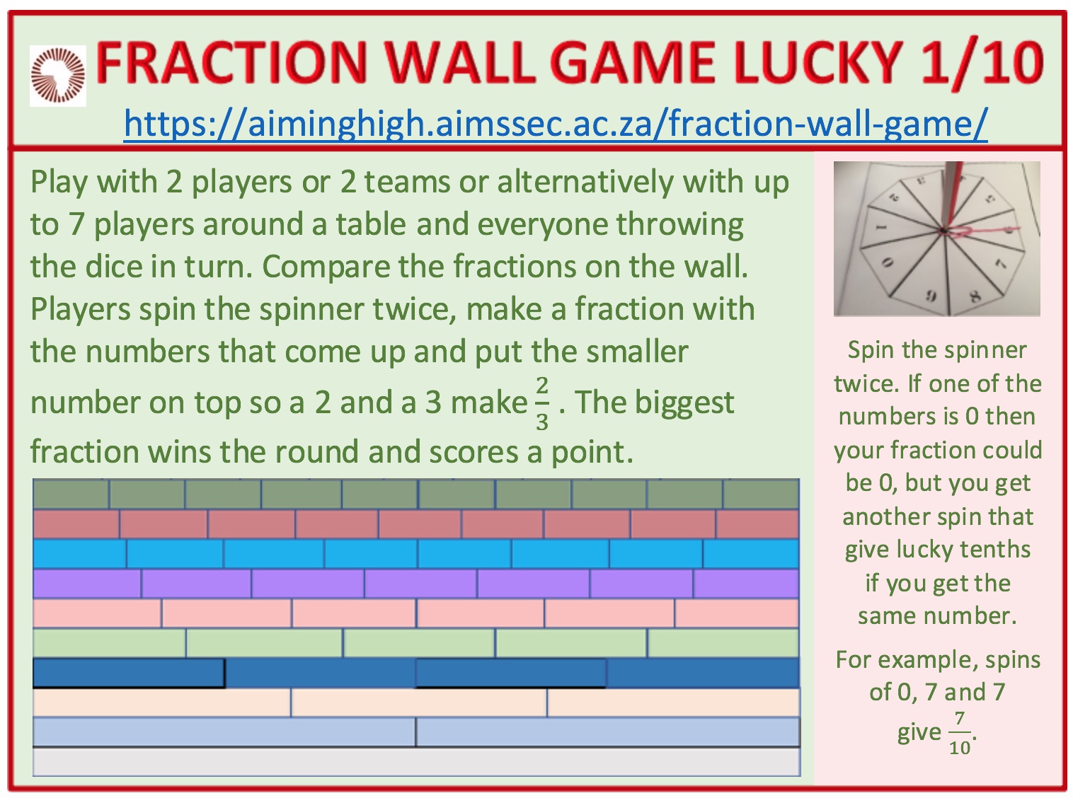 If time, play with walls of different heights that include smaller fractions. You will need to make spinners that show the digits needed for your game. The instructions show how to make your own spinner with digits 1 to 9 for the Fraction Wall Game on a wall built up to the layer of ninths on top.