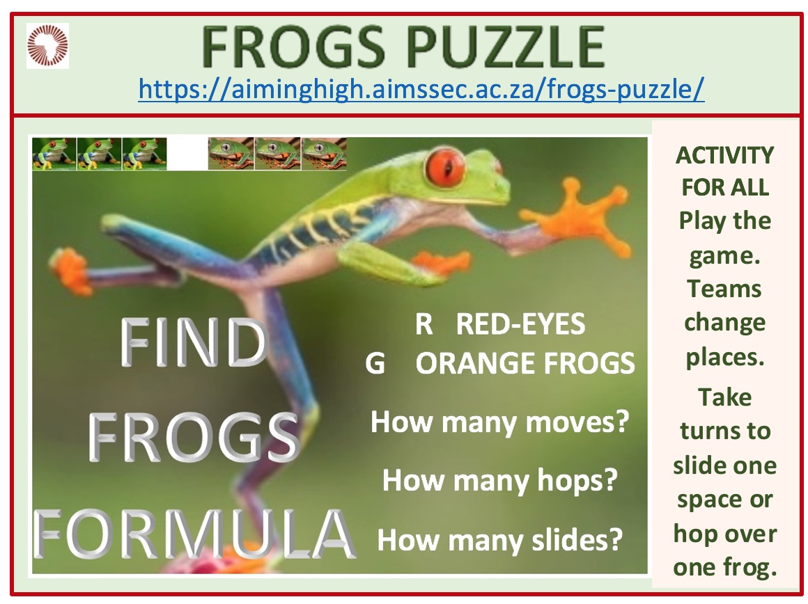 FROGS GAME Start with 3 frogs on each side and act out the frogs puzzle. You need 7 chairs and 3 people from each team on each side with an empty chair in the middle. If the players get blocked then start again. If there are more players in the teams then the extras can advise the active players. This is not a competitive game, rather a collaborative activity to solve the problem.