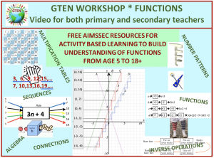 Click here for the Multiplication Tables to Functions GTEN workshop video. It follows the development of concepts of functions from clap counting in Year 1 to multipication tables, then to function box games, flow charts, reversing the flow and inverse functions, linear functions, combinations of functions then polynomial and other functions.