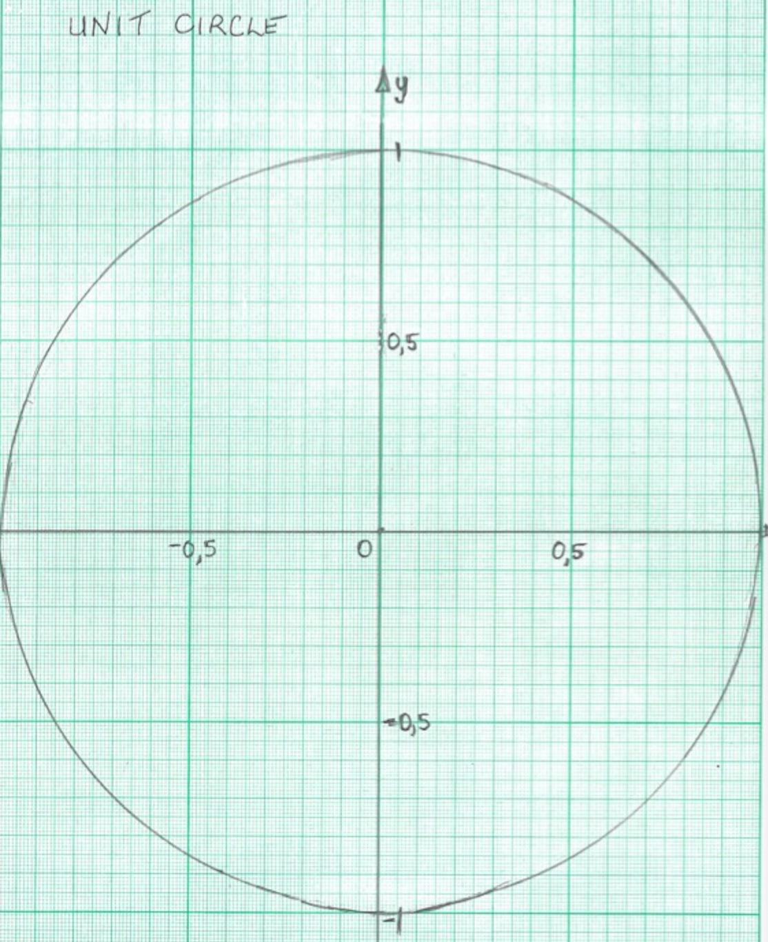 heet 1 use a protractor to measure an angle of 60o anti-clockwise from the x-axis and draw the lines OP and PNQ. The right angled triangle OPN has edges OP=1, ON=cos60o and PN=sin60o. From the lines on the grid you should see clear steps of 0,1 from -1 to + 1 in both x and y directions so you can take readings to 2 decimal places. Read the coordinates of P from the grid.