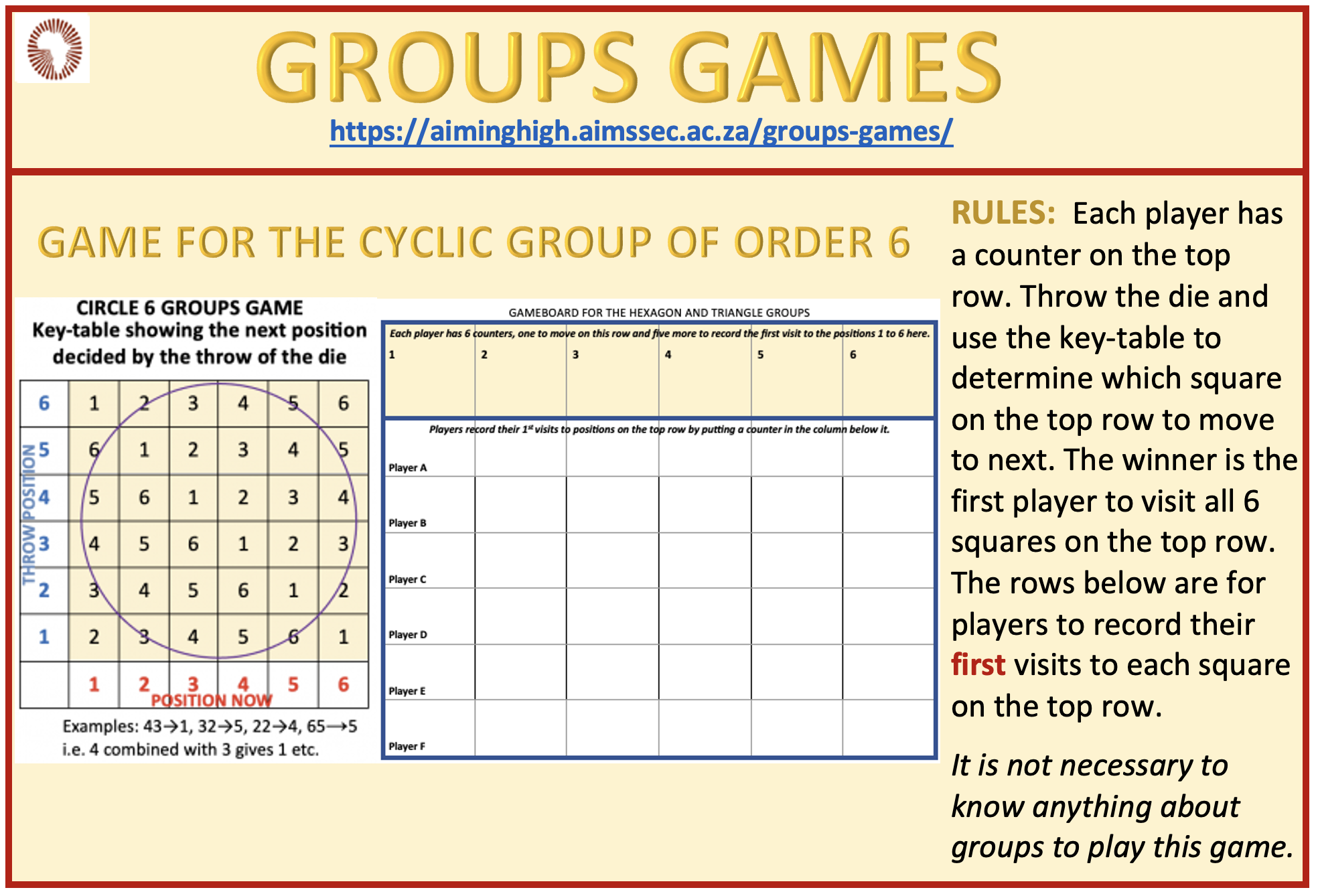 The Rectangle Group game is played in the same way using the Rectangle key-table. Recording visits by putting counters in columns is visually more effective than a written record, but players can use a single strip of 4 squares and record their first visit to each square in their own way. The Triangle and Hexagon Games for 6 elements are played in a similar way using a standard dice.