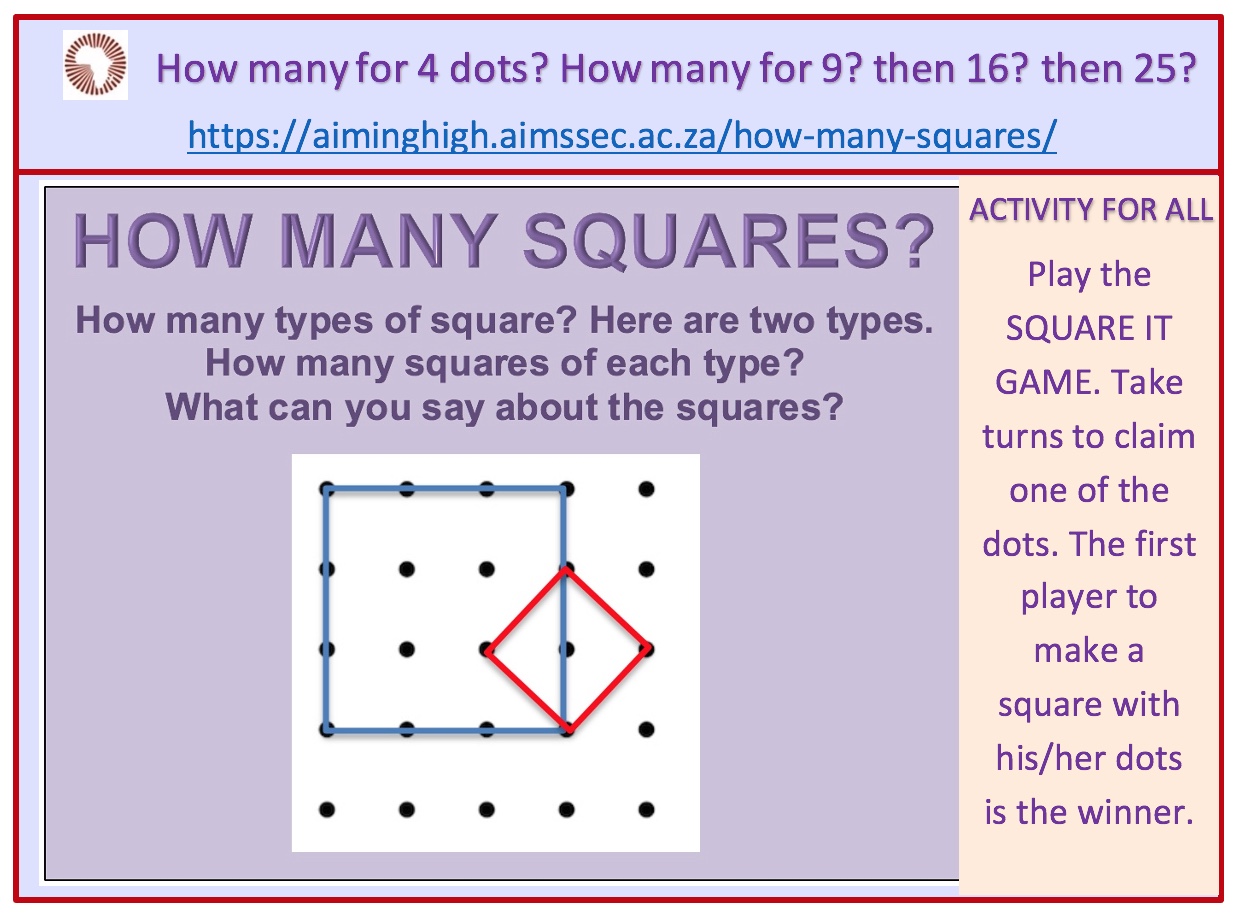 How Many Squares for a 5 by 5 grid of 25 dots?