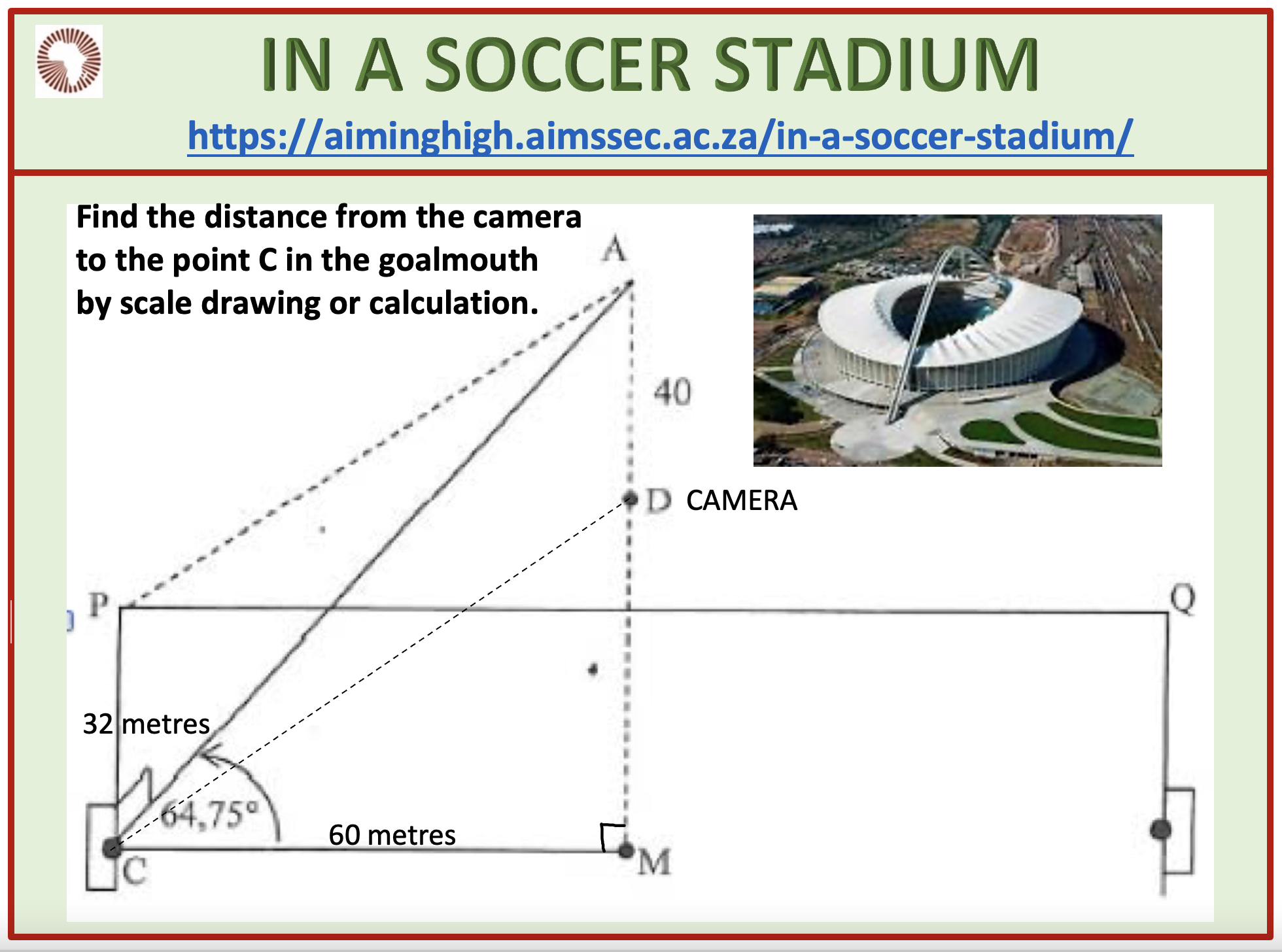The angle of elevation from a point C on the ground, at the centre of the goalpost is 64.75 degrees to the highest point A of the arc, directly above the centre of the Moses Madhiba Soccer Stadium in Durban. The soccer pitch is 100 metres long (PQ in the diagram) and 64 metres wide as prescribed by FIFA for World Cup rules. The length PC = 32 metres, M is the point at the centre of the pitch directly below A and C, and AC is perpendicular to PC. A camera is positioned at D, 40 metres directly below A. By scale drawing or using trigonometry find:
