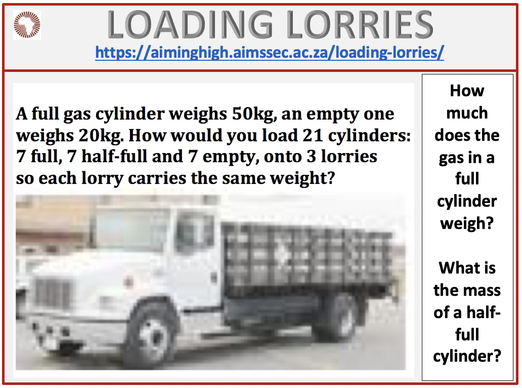 I have tried this one. They struggled with the weight of half full cylinder, the was one learner who said “If the half filled cyllinder should be 35kg then we must have 245kg per truck” after that the whole class manage to get solution.