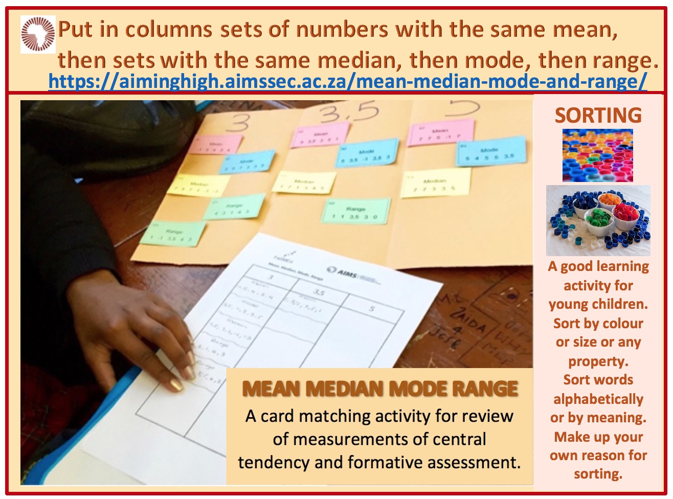 The teacher leads a discussion about the different types of averages, and about the meaning of the term ‘range’, and explains what the learners should do: decide which category each set of numbers falls into and then place the card accordingly. She or he can use some of the big cards to model the activity. Then the students work in small groups. After the learners finish the activity, the teacher holds a class discussion aiming to draw out something about the students’ own learning and to think about the bigger conceptual issues such as the fact that the different averages serve different purposes and that sometimes it is better to use one average and other times it is better to use another one.