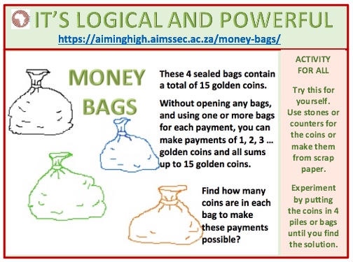 This problem is based on Money Bags from ‘Mathematical Challenges for Able Pupils published by UK DfES. You can download a copy here.