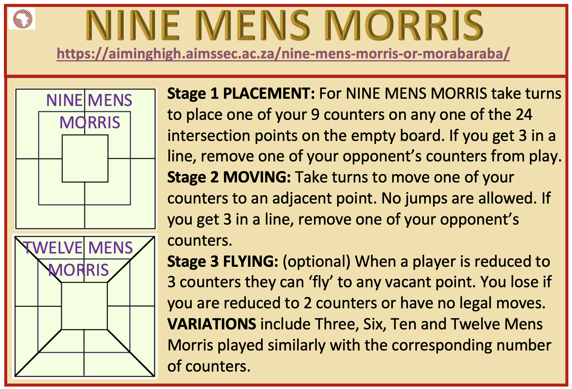 NINE MENS MORRIS is a game for two players and each needs 9 counters in their colour. Pieces are called men. Lines of 3 are called merrels or mills. The game is also called Cowboy Checkers or Ninepenny Marl.