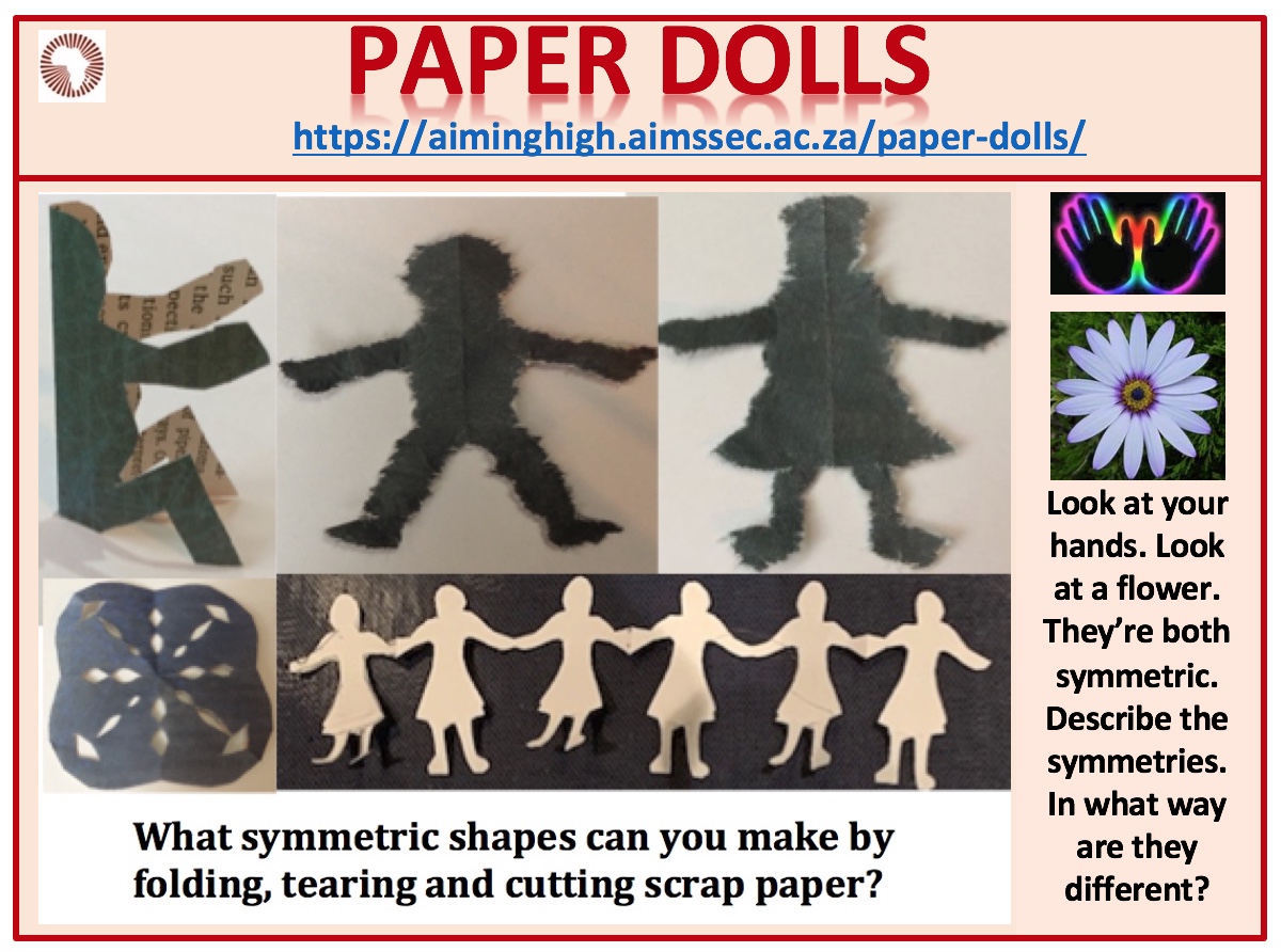 Fold a piece of paper in two and tear out half a person.  An old newspaper is good for this. Now open out your little person and flatten it. You have made a paper doll  that is symmetrical about the fold line. The two halves of the doll on each side of the fold line are reflections of each other. We call the fold line a mirror line