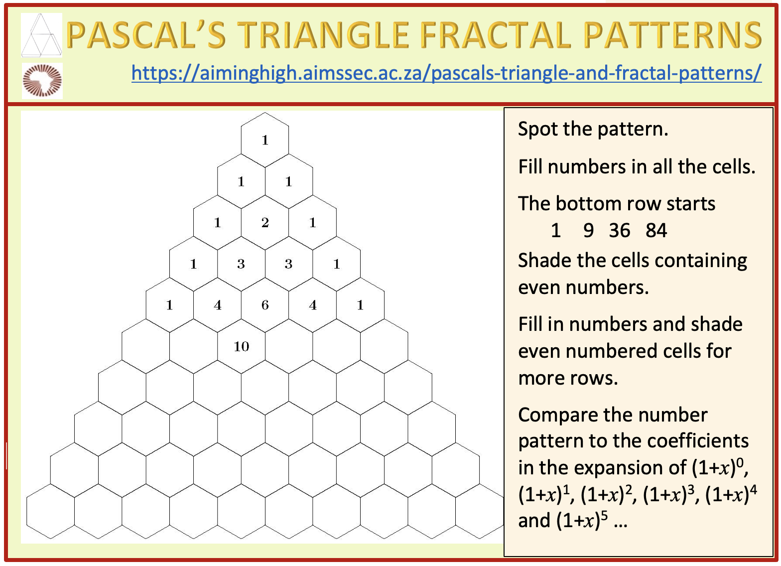 Click here for the PASCAL’S TRIANGLE AND FRACTAL PATTERNS worksheet