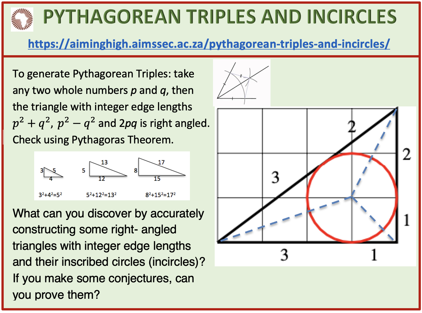 Click here to download a worksheet for Pythagorean Triples and Incircles.