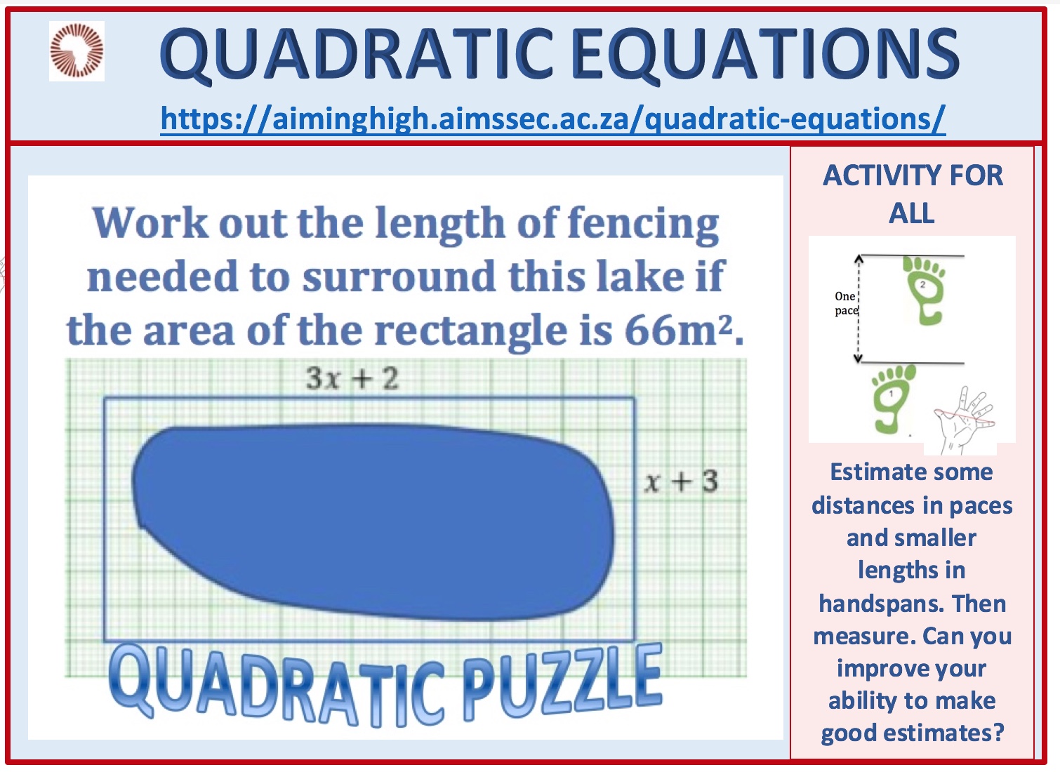 Click here for the QUADRATIC EQUATIONS Inclusion and Home Learning Guide. It offers related learning tasks on the theme of Perimeter suitable for learners of all ability levels and all ages from 5 to 18+.