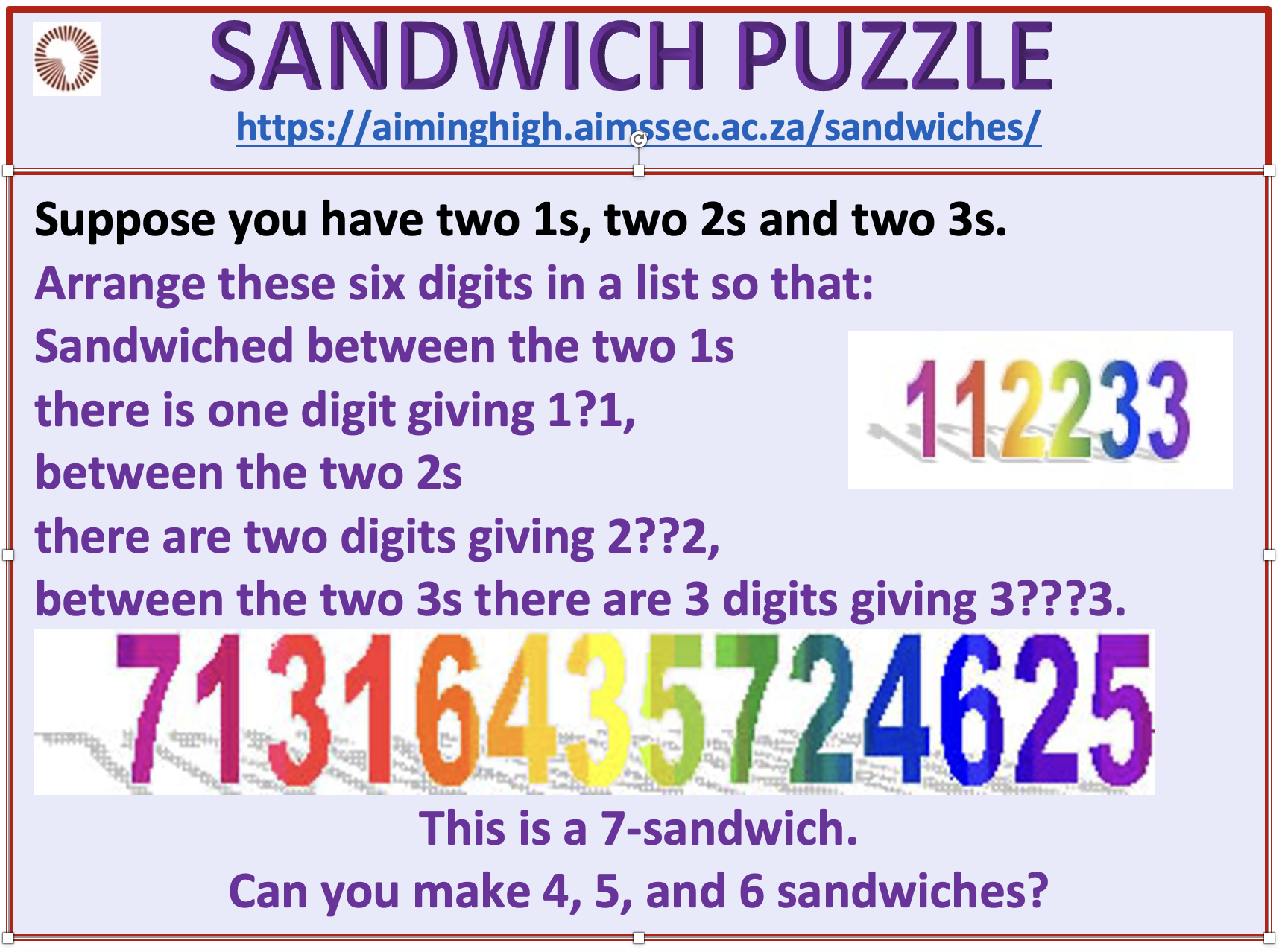 For some values of n it is possible to make n-sandwiches using pairs of every positive integer from 1 to n, and arranging the list according to the rules given above, and for other values of n it is not possible. The big challenge is to find when it is and when it is not possible.