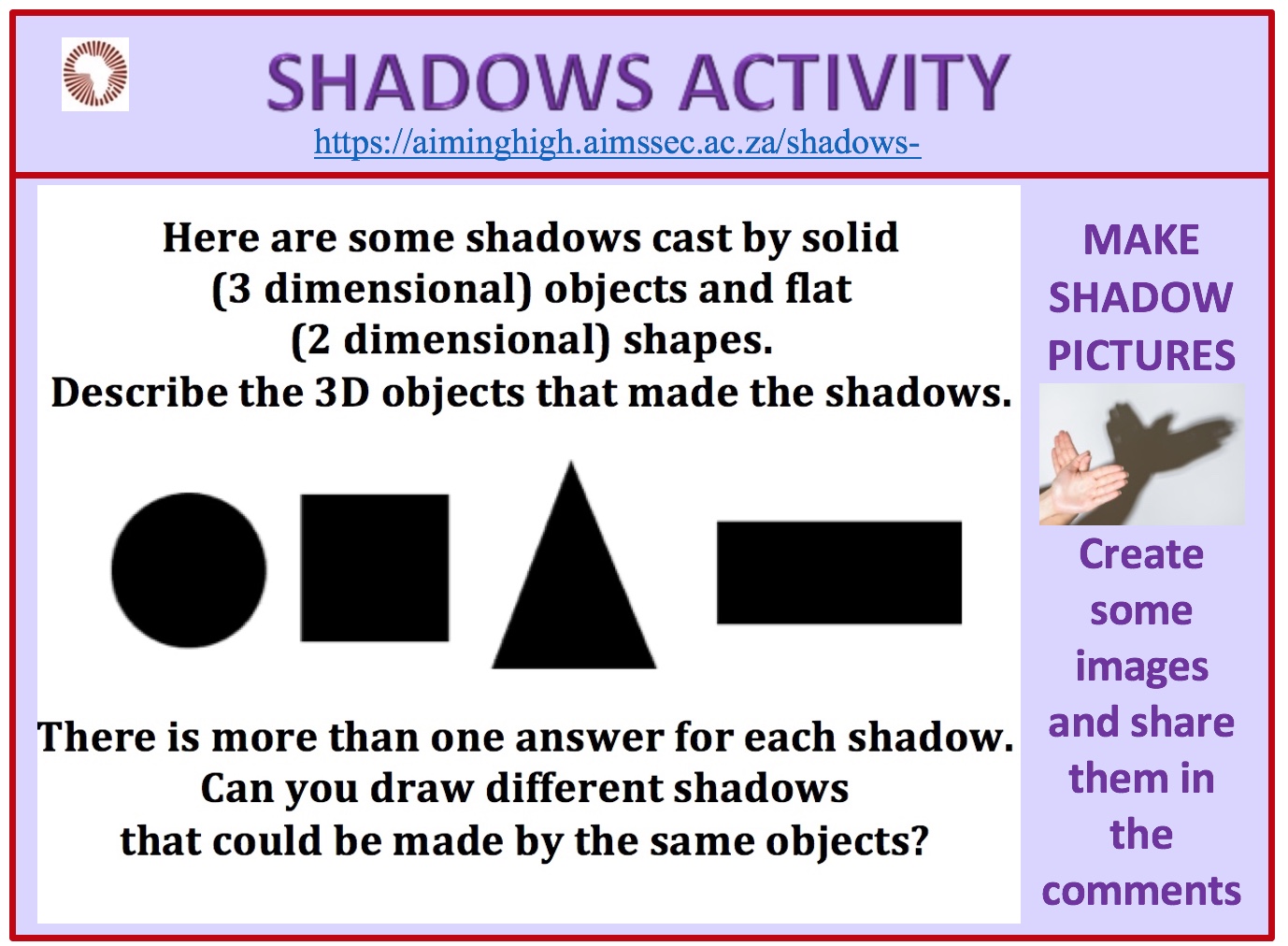 Casting shadows on the wall using sunlight, or a torch, and getting learners to discuss what 3D objects could make the shadows, is a great activity.