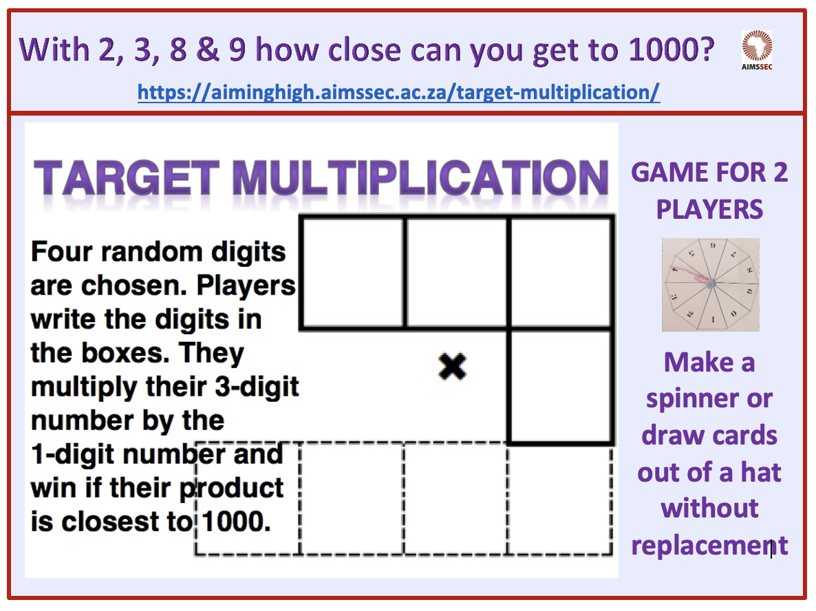 Another TARGET game for any number of players or for the whole class as a lesson starter. You want to win so THINK MATHEMATICALLY. To get near to the target of 1000 you must get the hundreds digit multiplied by the single digit number close to 10. So for those 2 digits aim for: 1×9, 2×4, 3×3, 4×2, 5×2, 6×1, 7×1 or 8×1. Think about which of those is best.