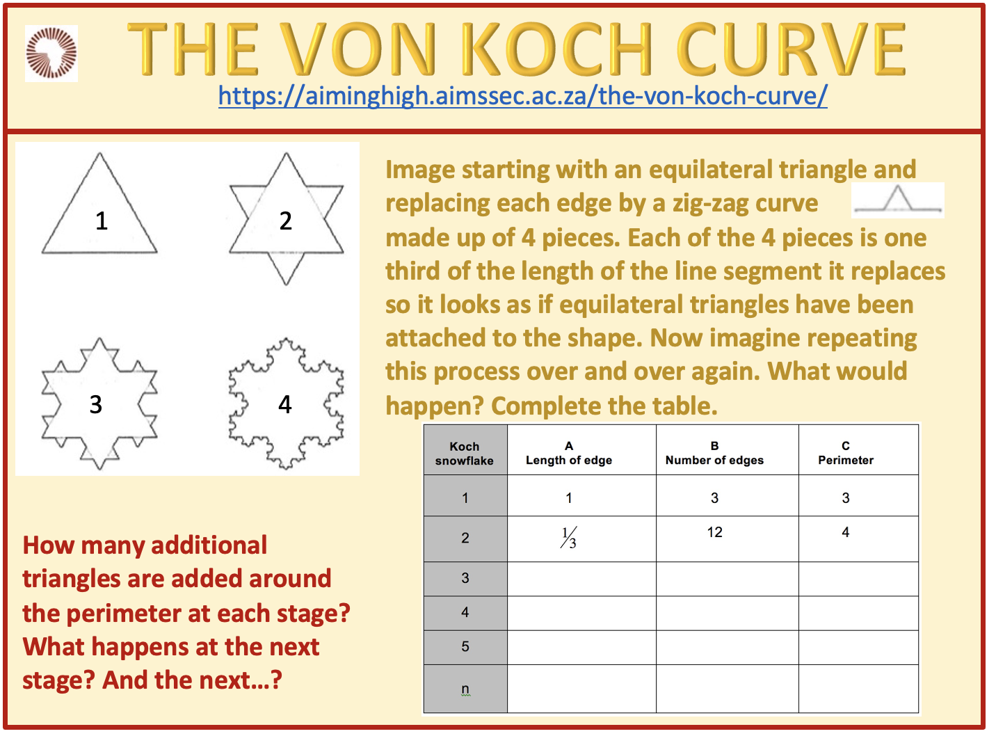 Investigate the increase in area of the Von Koch snowflake at successive stages. Call the area of the original triangle one unit and complete the table below.