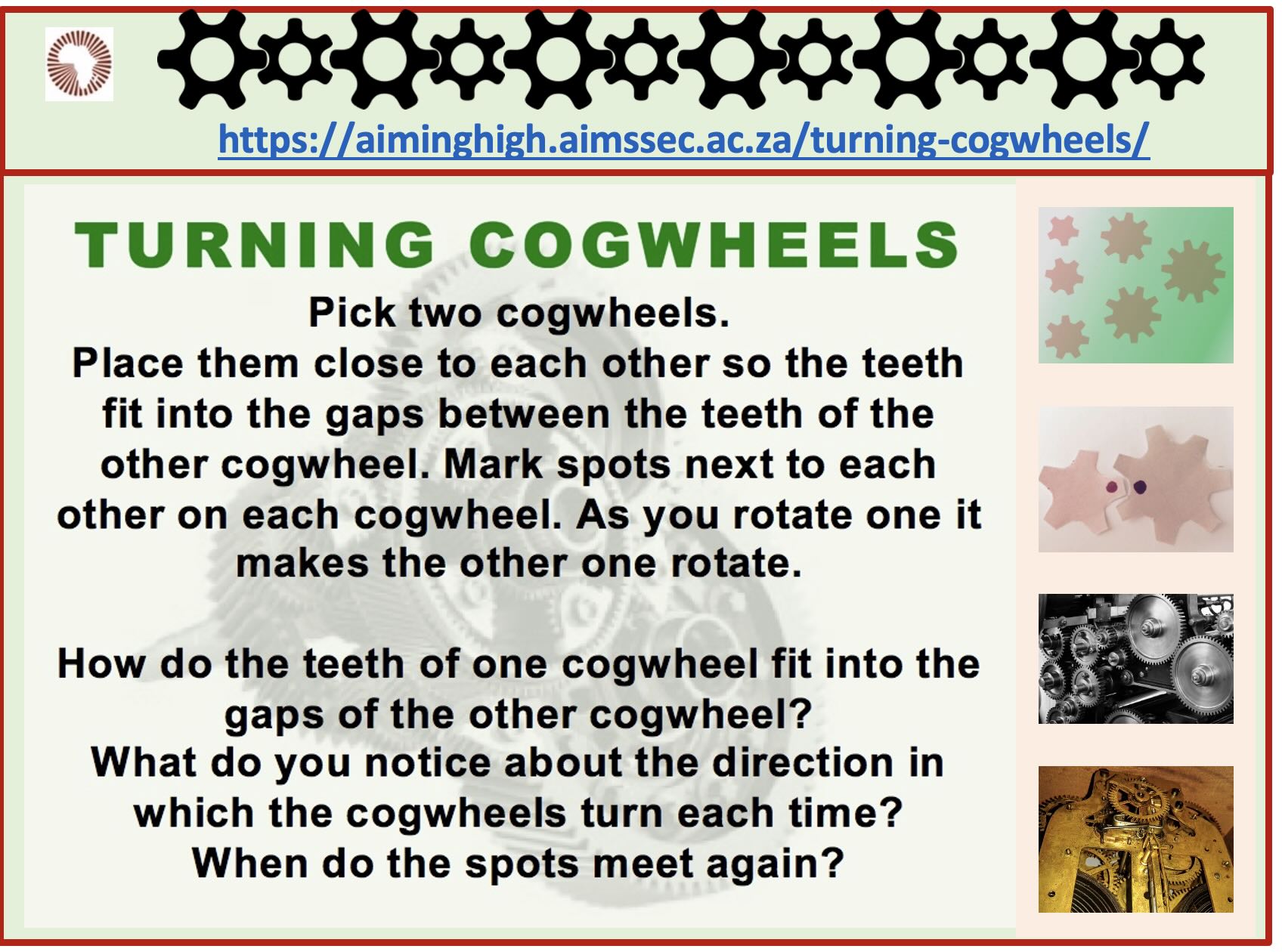 Now pick two cogwheels with 5 teeth and do the same again. What do you notice. Explain what happens.