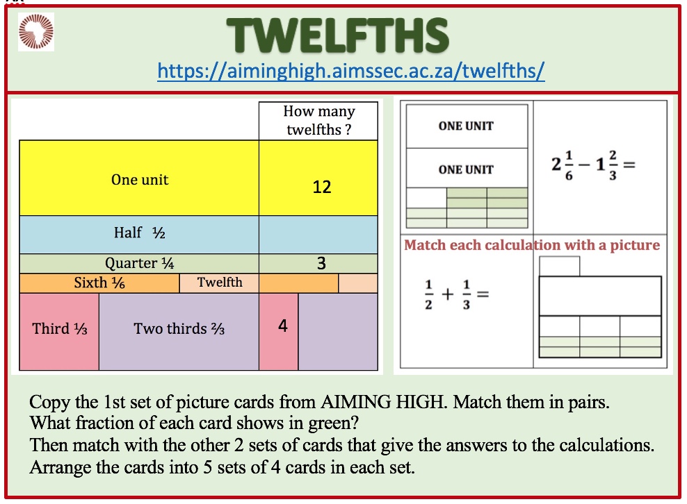 Write the number of twelfths for each fraction to match the colours. Three of the answers are filled in.