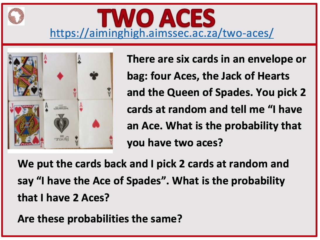 Next suppose I pick 2 of the 6 cards at random and tell you “I have the Ace of spades”. What is the probability that I have two Aces?