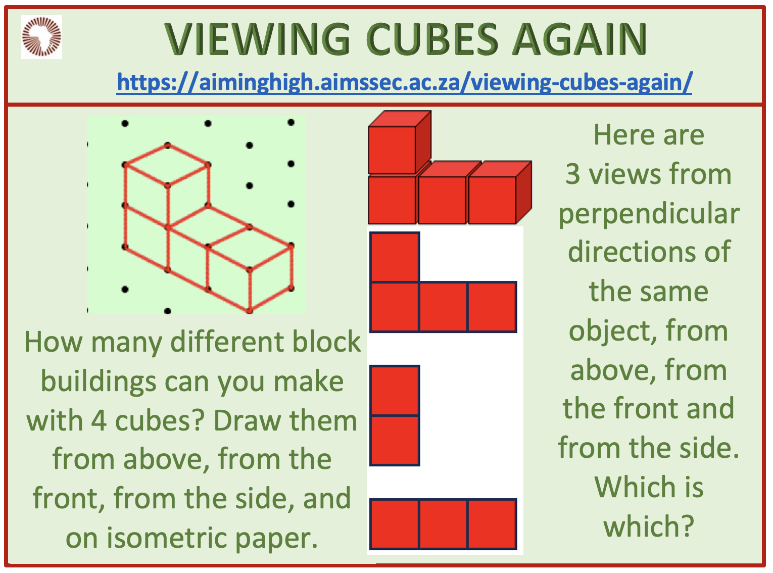 Make some different arrangements of 4 cubes.