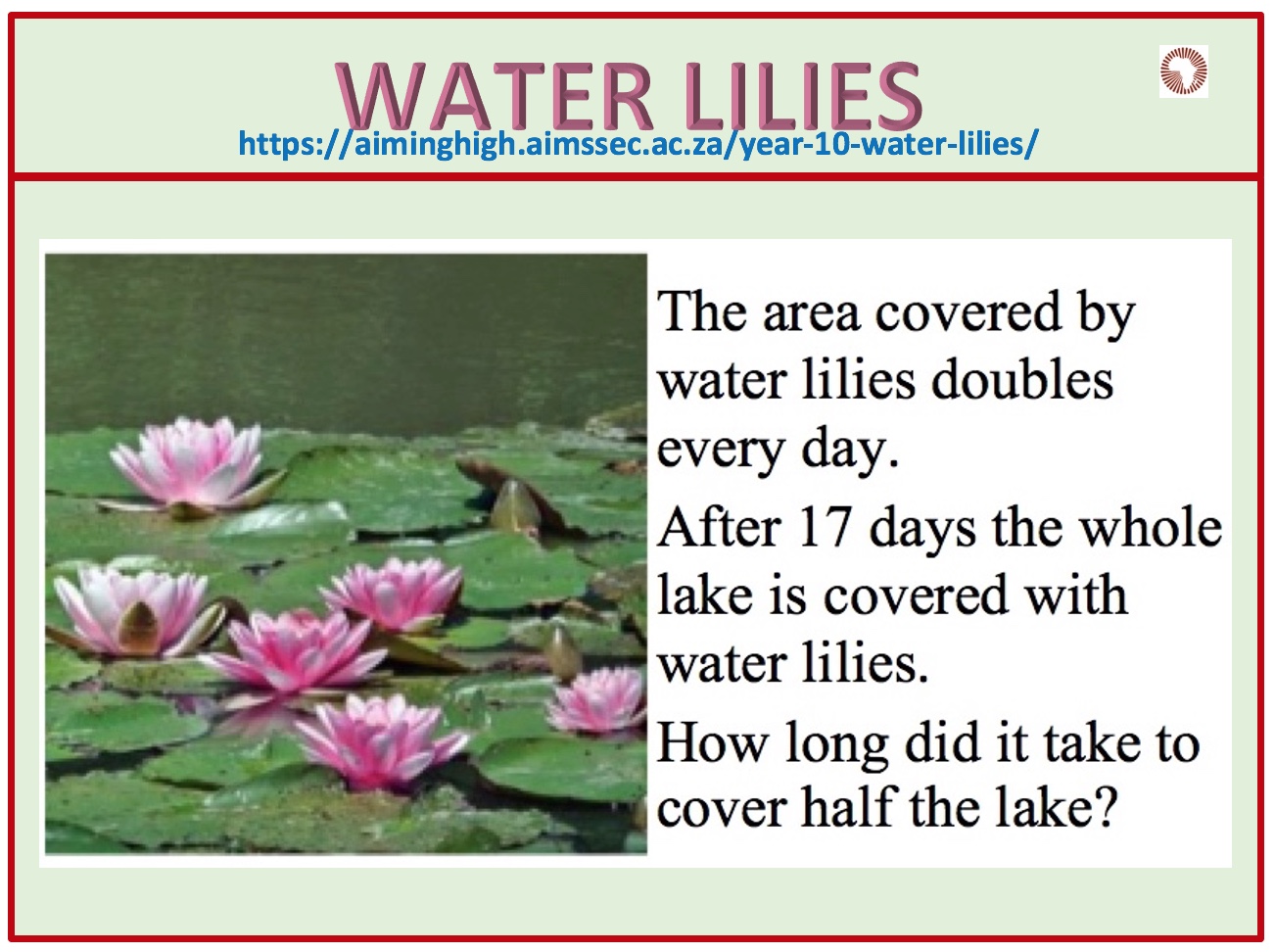This activity is adapted from the NRICH task Water Lilies with permission of the University of Cambridge. All rights reserved.